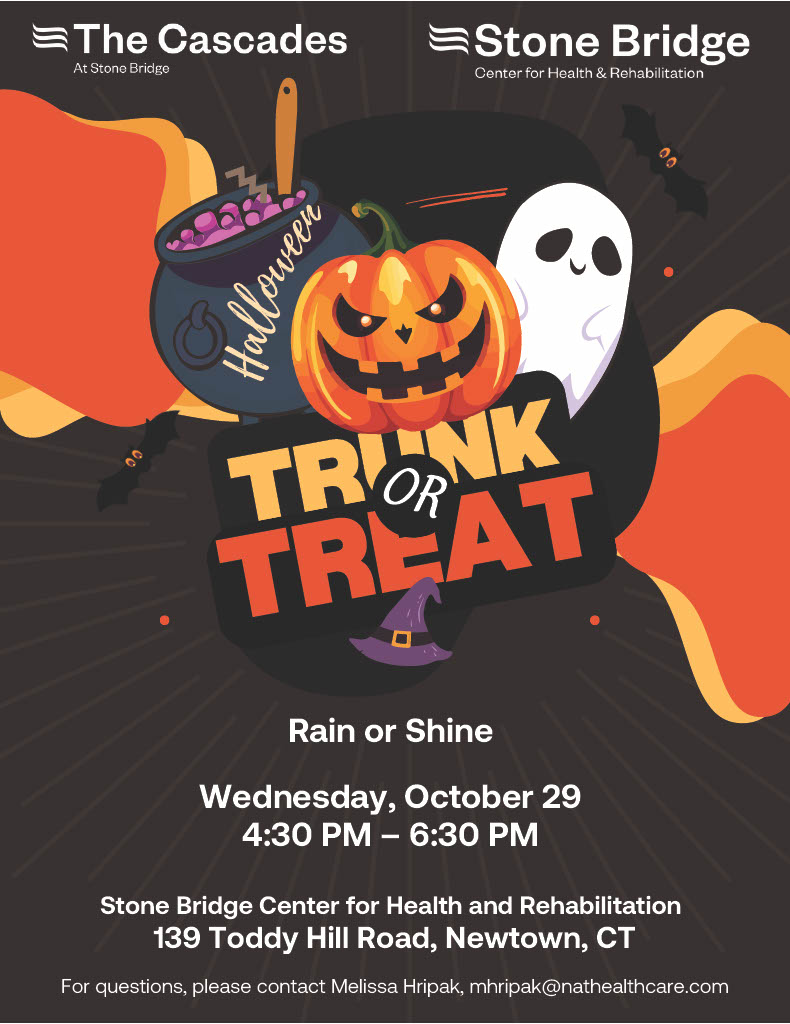 People of all ages are invited to dress up and trick-or-treat at various decorated trunks, light refreshments available, rain or shine; mhripak@nathealthcare.com.